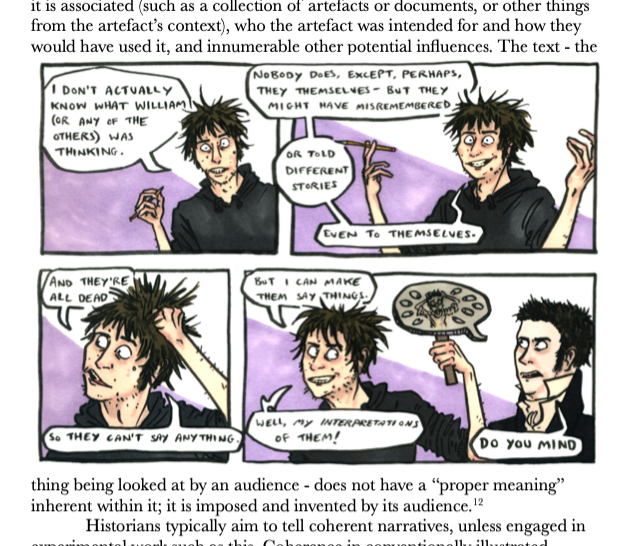 It's got a big introduction, 44 pages of comic, a copious conclusion, and a select bibliography. If you read the words, you'll understand more about my thinking behind it, but if you just want to look at the pictures, that's cool too.