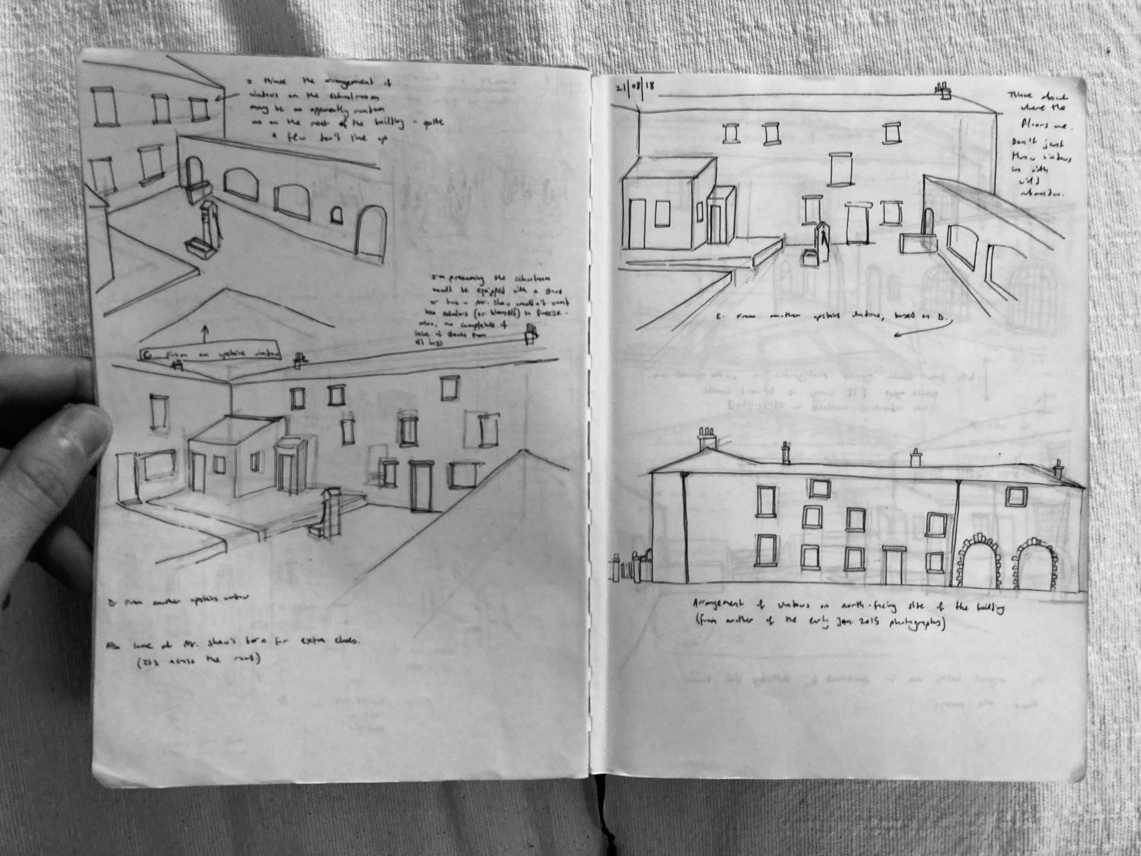 Following on from the previous sketchbook, I was trying to do some kind of reconstruction of what might've happened during a few minutes one morning at Bowes Academy. (Time-lapse video here!)